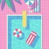 Retro 80’s Illustration of swimming pool as seen from above featuring diving board, swimming floats, umbrella and deck chair.